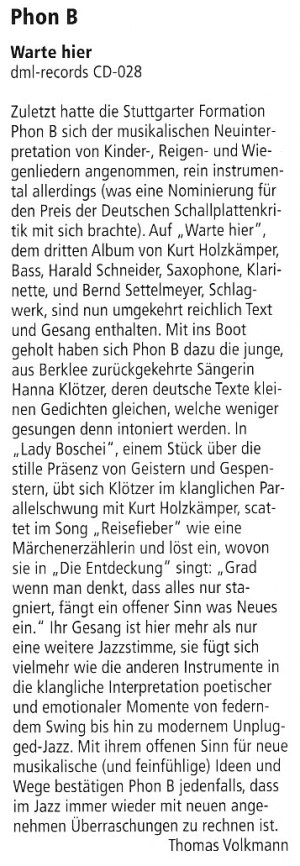 „ Harald Schneider bläst Tenor- und Sopransaxophon sowie auf der Bassklarinette Melodien, die nicht nur an die Klassiker erinnern. Ebenso souverän intergriert er orientalische und freie Elemente. Der Bassist Kurt Holzkämper bringt geradelinige Walking Lines ebenso selbstverständlich ins Spiel wie harten Funk, gelassenen Swing und geschnackvolle Freepassagen. Und Bernd Settelmeyer ist ein ungemein einfallsreicher Rhythmiker, der sein Drum- und Percussion-Set um eine Reihe afrikanischer Trommeln erweitert hat. Lange Zeit galt Köln als die Stadt mit der buntesten Jazzszene Deutschlands. Mit so eigenständigen, musikalisch anspruchsvollen und dabei äußerst unterhaltsamen Bands wie Phon B holt der Süden mächtig auf...“