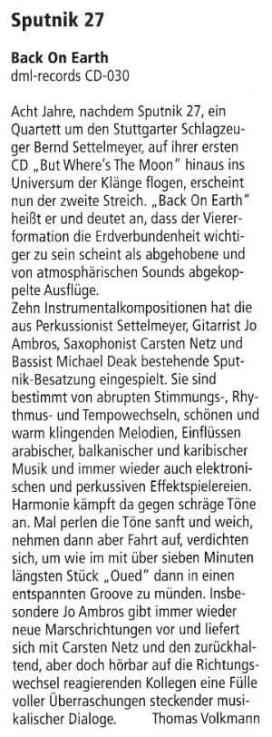 ...kreist wieder um die Erde. Mit neuem Programm, neuer Besetzung und neuen Reisekoordinaten! Bereits die dritte CD Einspielung des eigenwilligen Schlagzeugers und Percussionisten Bernd Settelmeyer mit seiner Band. Neben instrumentalen Titeln finden sich auch Stücke mit deutschen Texten in lakonischen Atmosphären aus dem interstellaren Raum, hier bei uns auf der Erde. „DREH DICH UM“, heißt das neue Programm und die dazugehörige CD.