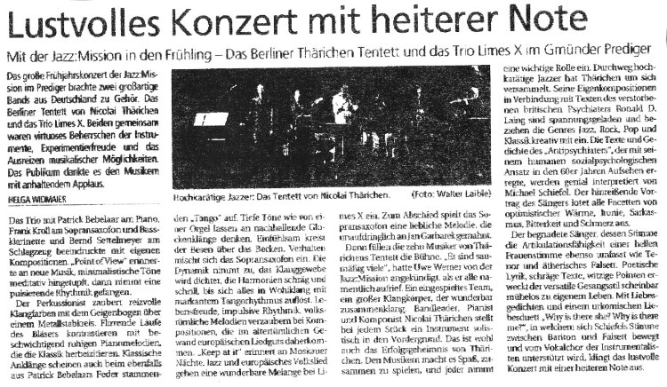 „ Es scheint ein ganz besonderer, weil unsichtbarer Grenzwall zwischen Volksmusik und Jazz zu existieren. Das Stuttgarter Trio "Limes X" hat ihn konsequent - und vielleicht endgültig niedergerissen.“