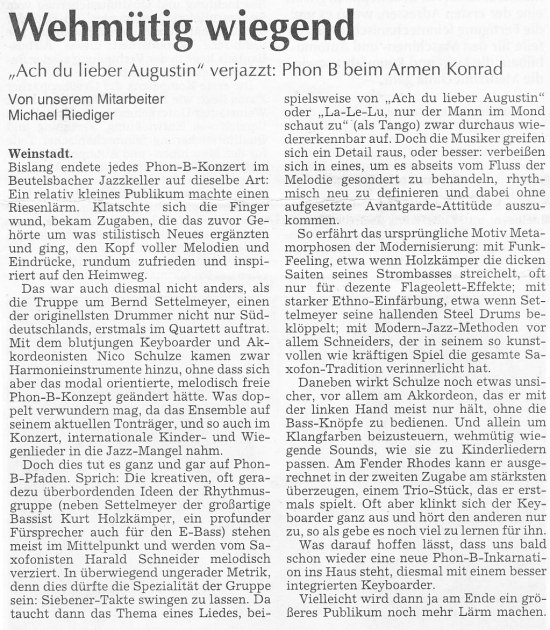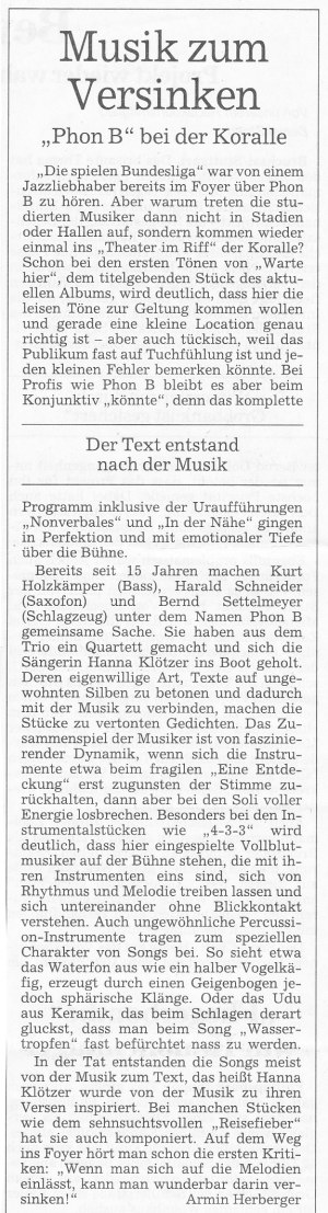 „ Harald Schneider bläst Tenor- und Sopransaxophon sowie auf der Bassklarinette Melodien, die nicht nur an die Klassiker erinnern. Ebenso souverän intergriert er orientalische und freie Elemente. Der Bassist Kurt Holzkämper bringt geradelinige Walking Lines ebenso selbstverständlich ins Spiel wie harten Funk, gelassenen Swing und geschnackvolle Freepassagen. Und Bernd Settelmeyer ist ein ungemein einfallsreicher Rhythmiker, der sein Drum- und Percussion-Set um eine Reihe afrikanischer Trommeln erweitert hat. Lange Zeit galt Köln als die Stadt mit der buntesten Jazzszene Deutschlands. Mit so eigenständigen, musikalisch anspruchsvollen und dabei äußerst unterhaltsamen Bands wie Phon B holt der Süden mächtig auf...“