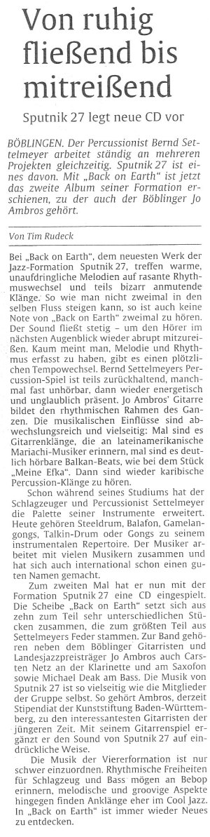 ...kreist wieder um die Erde. Mit neuem Programm, neuer Besetzung und neuen Reisekoordinaten! Bereits die dritte CD Einspielung des eigenwilligen Schlagzeugers und Percussionisten Bernd Settelmeyer mit seiner Band. Neben instrumentalen Titeln finden sich auch Stücke mit deutschen Texten in lakonischen Atmosphären aus dem interstellaren Raum, hier bei uns auf der Erde. „DREH DICH UM“, heißt das neue Programm und die dazugehörige CD.